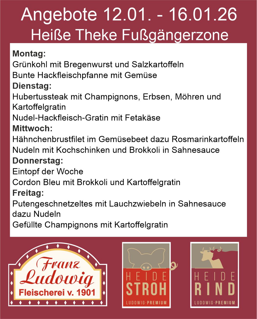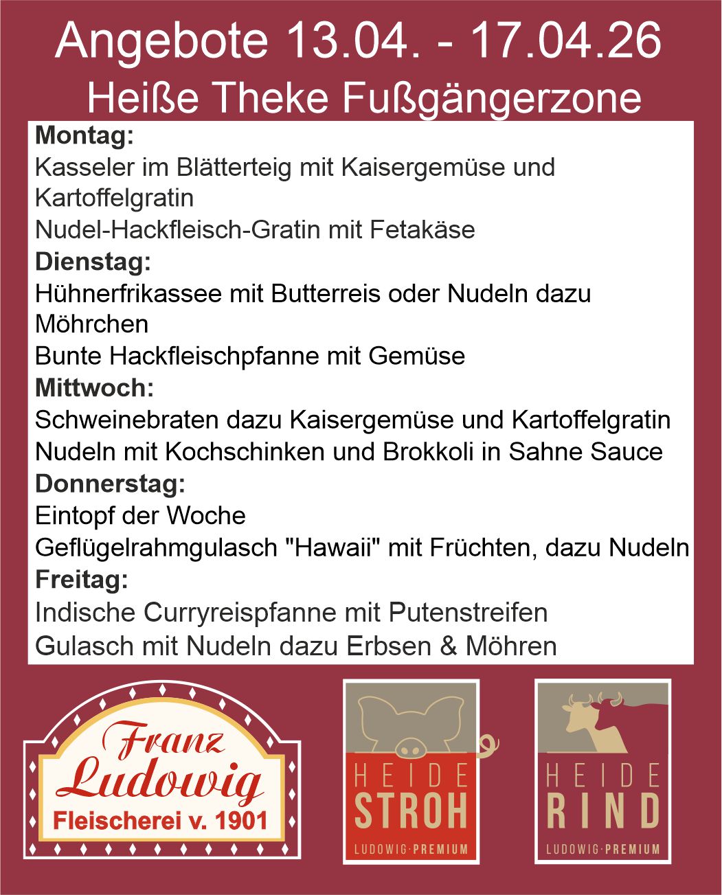 Unsere Auswahl im Mittagsmenü an der Heißen Theke Fußgängerzone wechselt jede Woche. Hier finden Sie unser aktuelles Angebot.